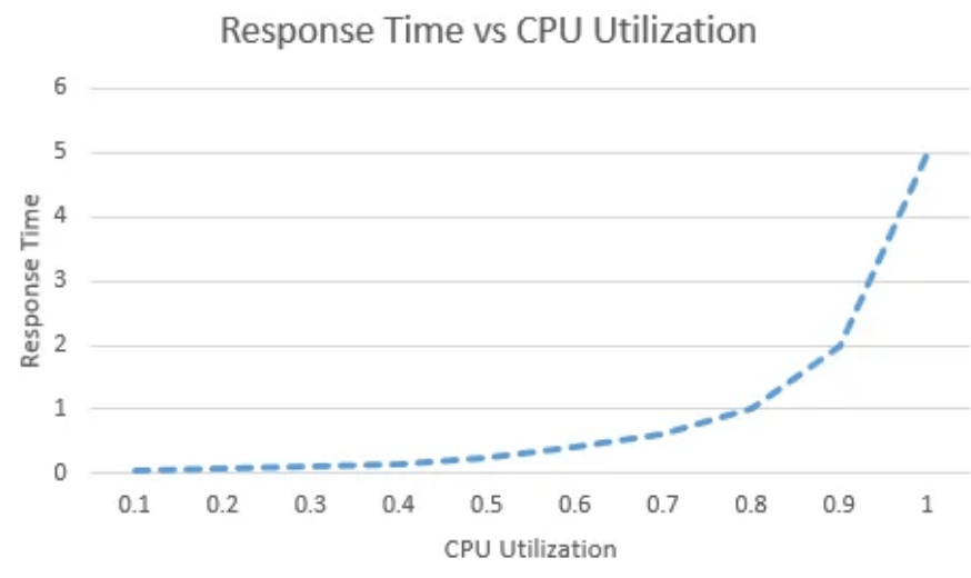 As shown, queuing time rises sharply when CPU utilization exceeds 70%. This threshold—often called the ‘knee’ of the hockey-stick curve—marks the point where delays become significant. Above this 70% mark, response times deteriorate quickly, underscoring how heavily utilization affects system performance.