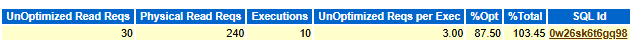 For this SQL, we can see that this SQL performed 240 physical read requests, out of which only 30 were traditional physical reads. The remaining 210 (240 – 30) were optimized by Smart Flash Cache, resulting in an optimization rate of 210 ÷ 240 = 87.5%. This means the Smart Flash Cache successfully handled most of the I/O requests for this SQL.