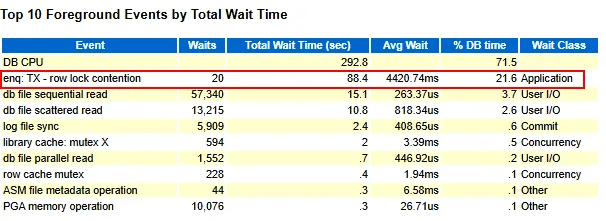 - The only significant wait event besides CPU and IO in the top event list is “enq: TX – row lock contention”.