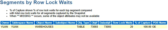 Next, we can identify which segments were involved in the contention using the “Segments by Row Lock Waits” subsection of the “Segment Statistics” section.