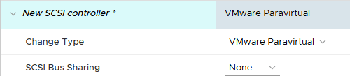 We will be using the multi-writer flag to share the disks (a VMware best practice), so the SCSI Bus Sharing should stay set to “None”. The SCSI Controller should also be set to VMware Paravirtual for best performance.