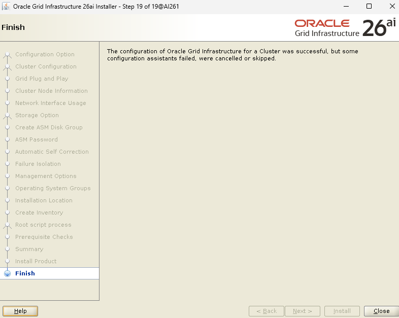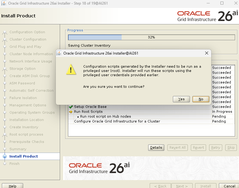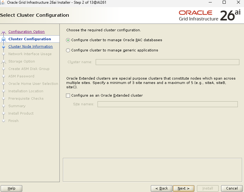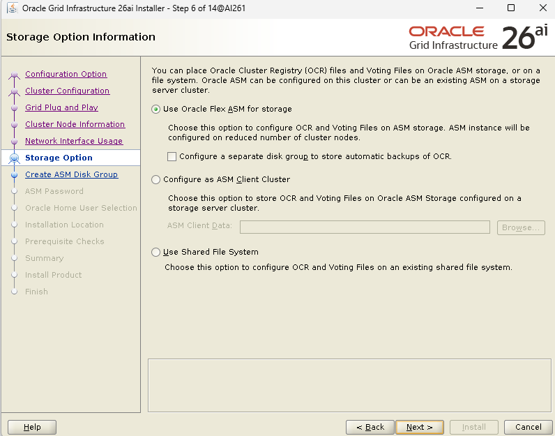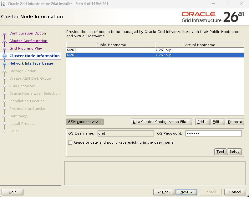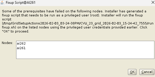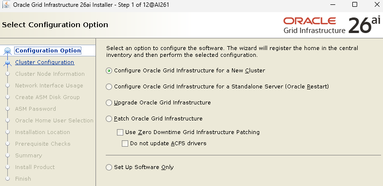 [root@AI261 ~]# mv LINUX.X64_2326100_grid_home.zip /u01/app/26ai/grid/[root@AI261 ~]# su - grid[grid@AI261 ~]$ cd $ORACLE_HOME[grid@AI261 grid]$ unzip -q LINUX.X64_2326100_grid_home.zip[grid@AI261 grid]$ ./gridSetup.shLaunching Oracle Grid Infrastructure Setup Wizard...