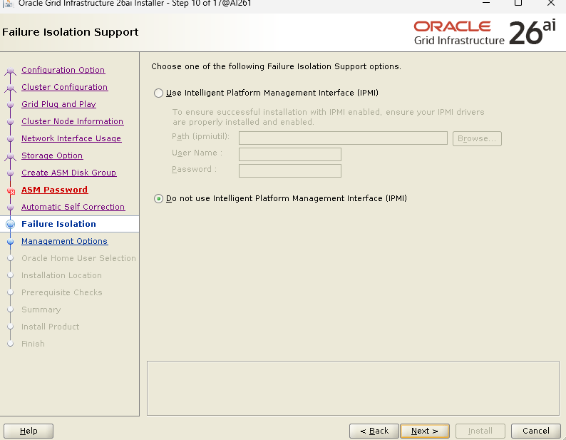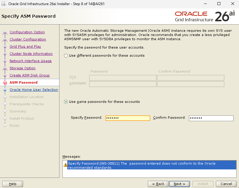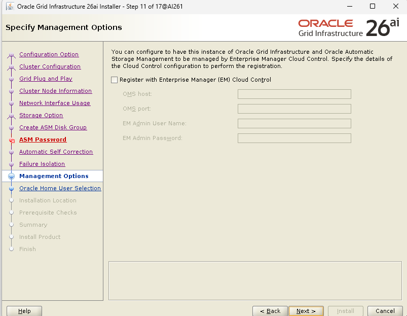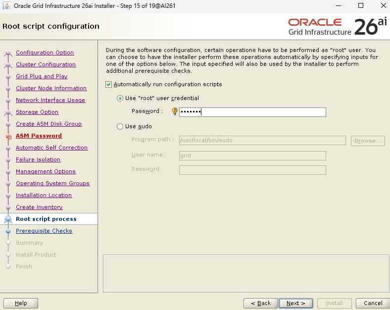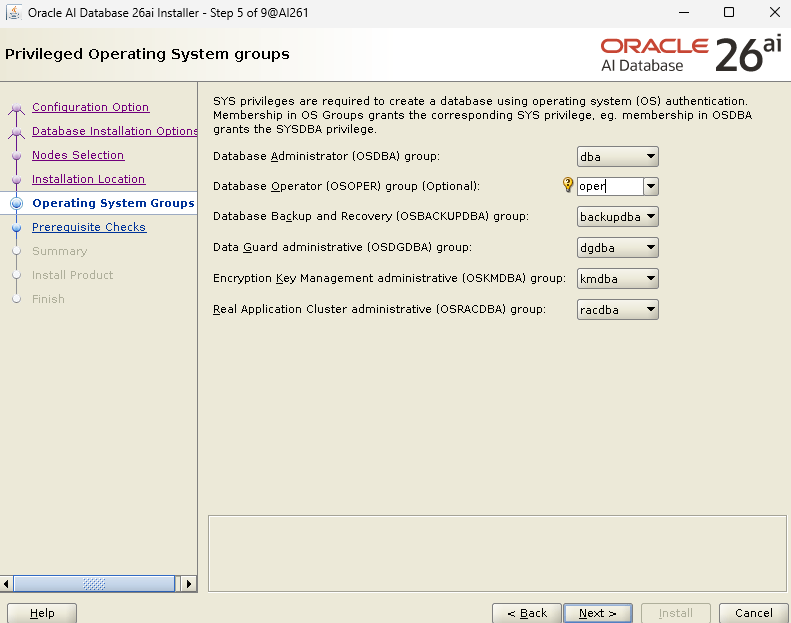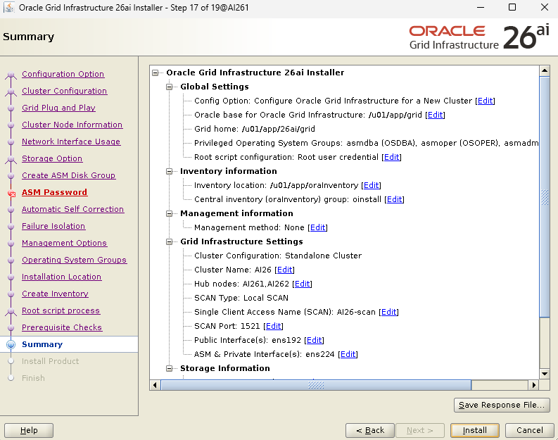 dnf -y install oracle-ai-database-preinstall-26ai# Create ASM groups and Grid usergroupadd -g 54331 asmadmingroupadd -g 54332 asmdbagroupadd -g 54333 asmoperuseradd -u 54322 -g oinstall -G asmadmin,asmdba,asmoper,dba grid# Update Oracle user groupsusermod -a -G asmdba oracle# Apply limits for grid usercp /etc/security/limits.d/oracle-ai-database-preinstall-26ai.conf /etc/security/limits.d/grid.confsed -i 's/oracle/grid/g' /etc/security/limits.d/grid.conf