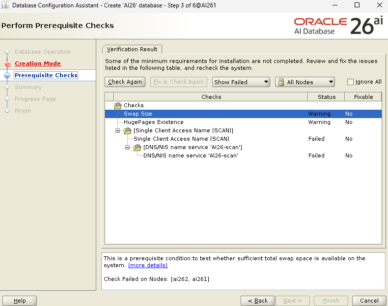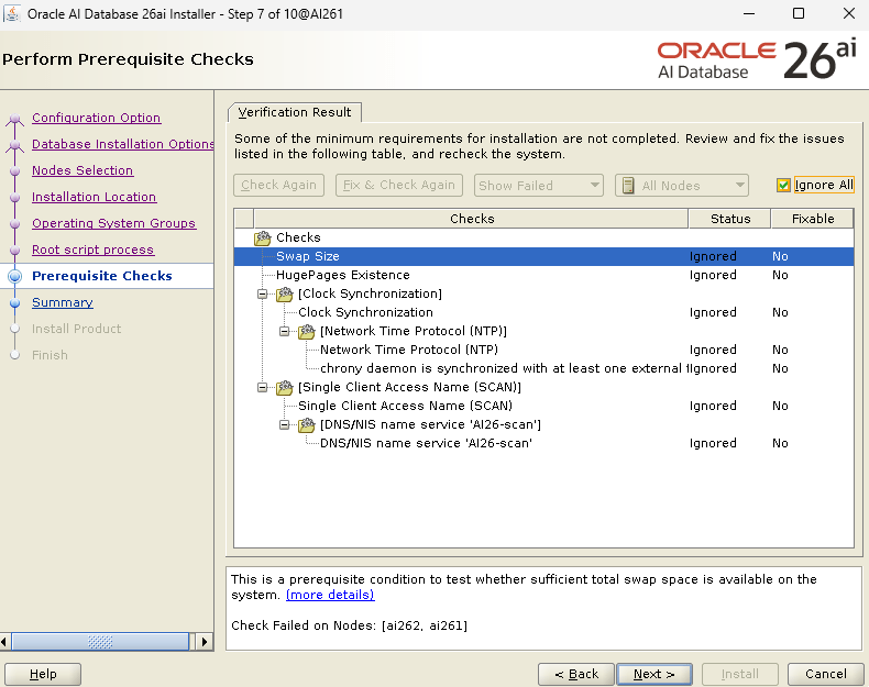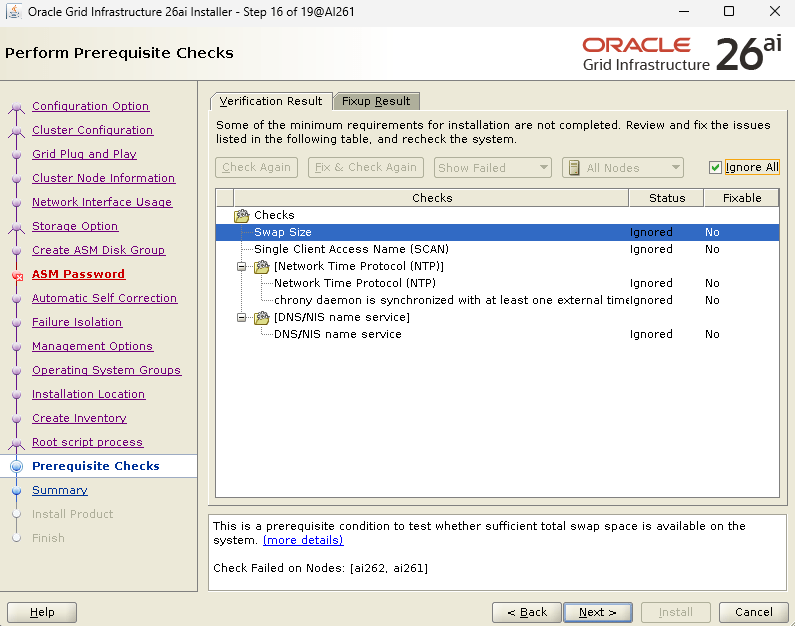 Note: SCAN and NTP check failures can be ignored as we are using /etc/hosts and have verified manual sync.