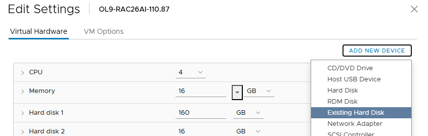 Next, when adding the four VMDKs to the other nodes by select “Existing Hard Disk”, and add them to a newly created SCSI controller.