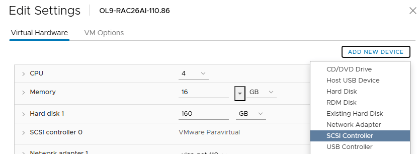 First we add the second SCSI controller. All the shared disks will be on this controller.