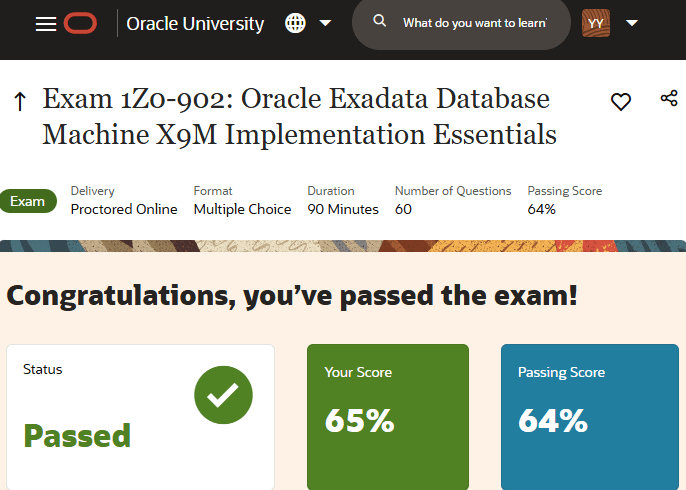 This week, I tackled the Oracle Exadata Database Machine X9M Implementation Essentials (1Z0-902) exam. With the passing score set at 64%, I emerged with a 65%. Some might call it a close shave; I console myself by calling it a perfectly calibrated effort for one of the most demanding certifications in the Oracle ecosystem.